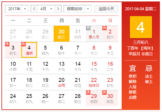 一、放假時(shí)間安排:2017年4月2日(星期日)至2017年4月4日(星期二)放假,共3天,4月5日(星期三)正常上班